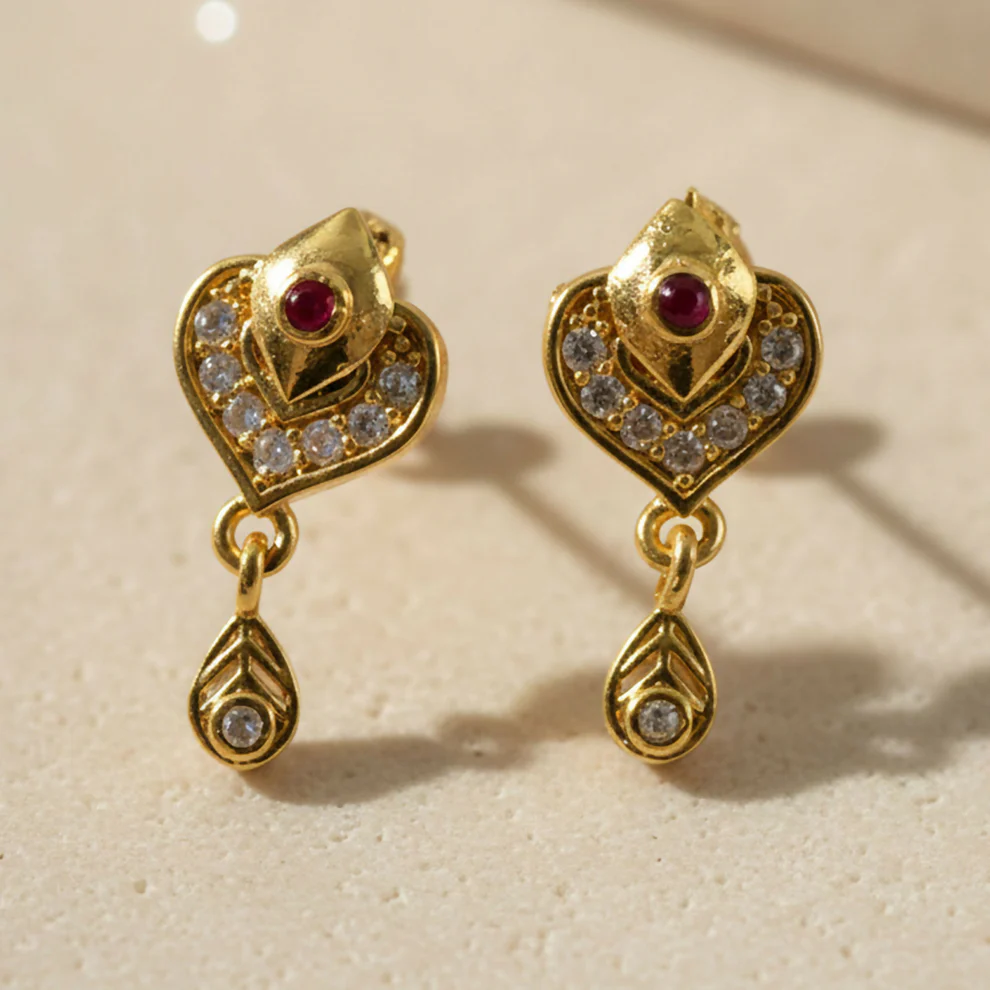 These exquisite gold drop earrings showcase a romantic heart-inspired design, crafted with fine detailing and a luxurious finish. Each earring features a layered heart motif accented with shimmering white crystals, creating a radiant frame around a deep ruby-red centerpiece that adds richness and elegance. The design is completed with a delicate teardrop dangle set with a sparkling stone, adding graceful movement and charm.